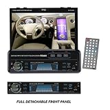 - This in-dash single-DIN headunit has a 7-inch, fully detachable motorized touch-screen display! It’s equipped with everything you need to make your vehicle into a mobile entertainment system on wheels: a player that supports AM/FM, DVD, VCD, CD, MP3 CD, SD cards, USB sticks, and a front panel AUX input to conveniently plug in your MP3 player or iPod. You’ll be enjoying your favorite movies, TV shows, and video clips on this crystal-clear 1440 x 234 resolution screen in no time. Easily tweak your image and sound using the brightness, contrast, chroma, hue, treble, bass, balance, and fader controls. Store your favorite stations on the 30 presets, or control the balance of your music using the built-in DSP equalizer. Anti-shock protection keeps your multimedia smooth and skip-free. With 80 watts on each of the four channels and subwoofer, this head-unit has power! Control from the backseat using the included fully functional wireless remote. Compatible with both NTSC and PAL.